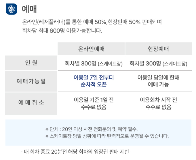 - 매 회차당 온라인예매 300명, 현장예매 300명 선착순 마감됩니다. (사전예약은 레저플래너 예약사이트에서 합니다.)