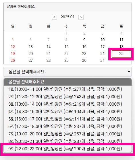 예약사이트에서 보면 토요일에 9회차 (밤10시~11시) 입장권이 나오는 것을 확인할 수 있습니다.
